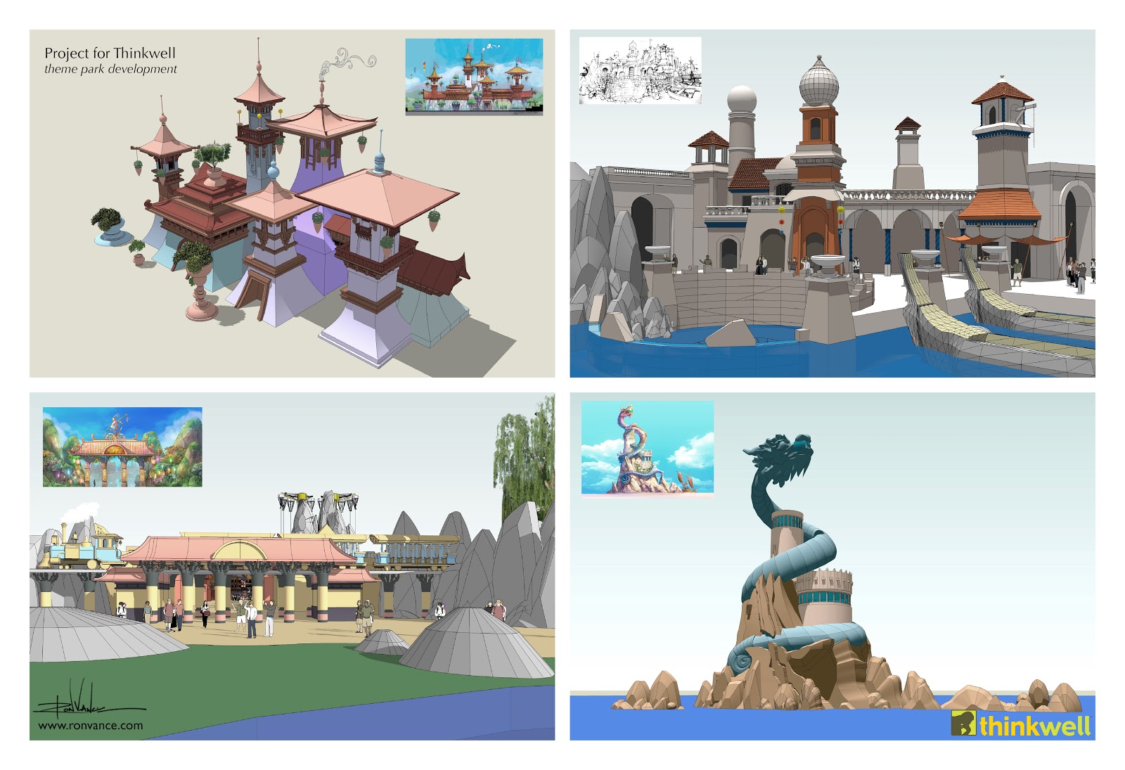 I've added some new work below—SketchUp models of the various theme lands based on the thumbnail sketches attached (done by other artists).